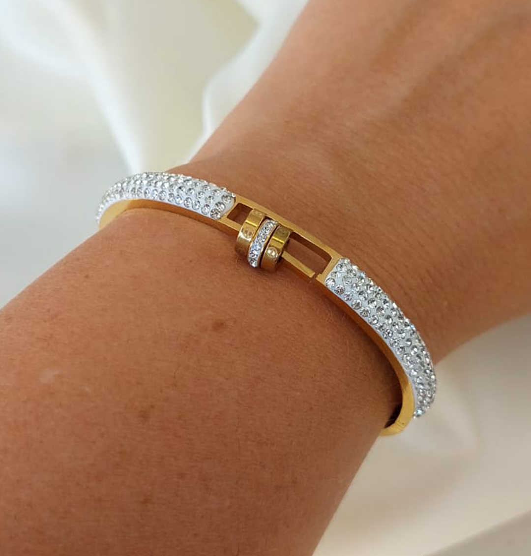 Bracelete Cravejado com Zircônia 3 Fileiras – 3 Anéis – Aço Dourado