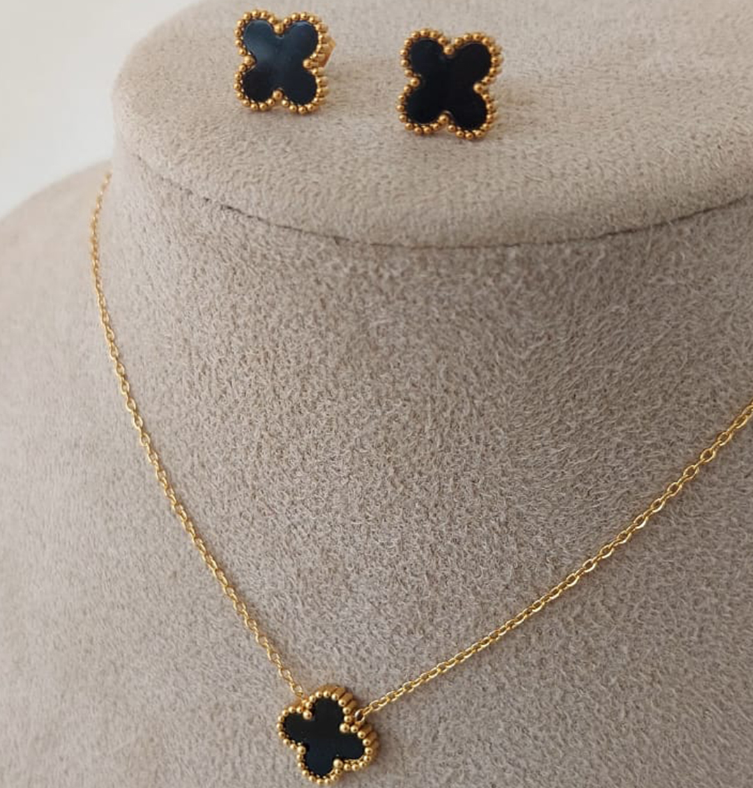 Conjunto Colar + Brinco Trevo Preto – Aço Dourado